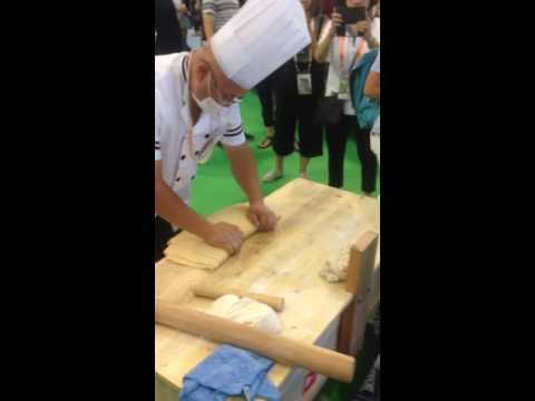 「坐」麵條在2016台灣美食展。貴州槓子麵老闆來台,表演屁股壓麵條。老闆說,他「坐」麵40多年,每天至少製麵40斤,不是用屁股壓棍就是用垮下施力。偷偷問他會不會痛?他說早就坐到長繭了。...